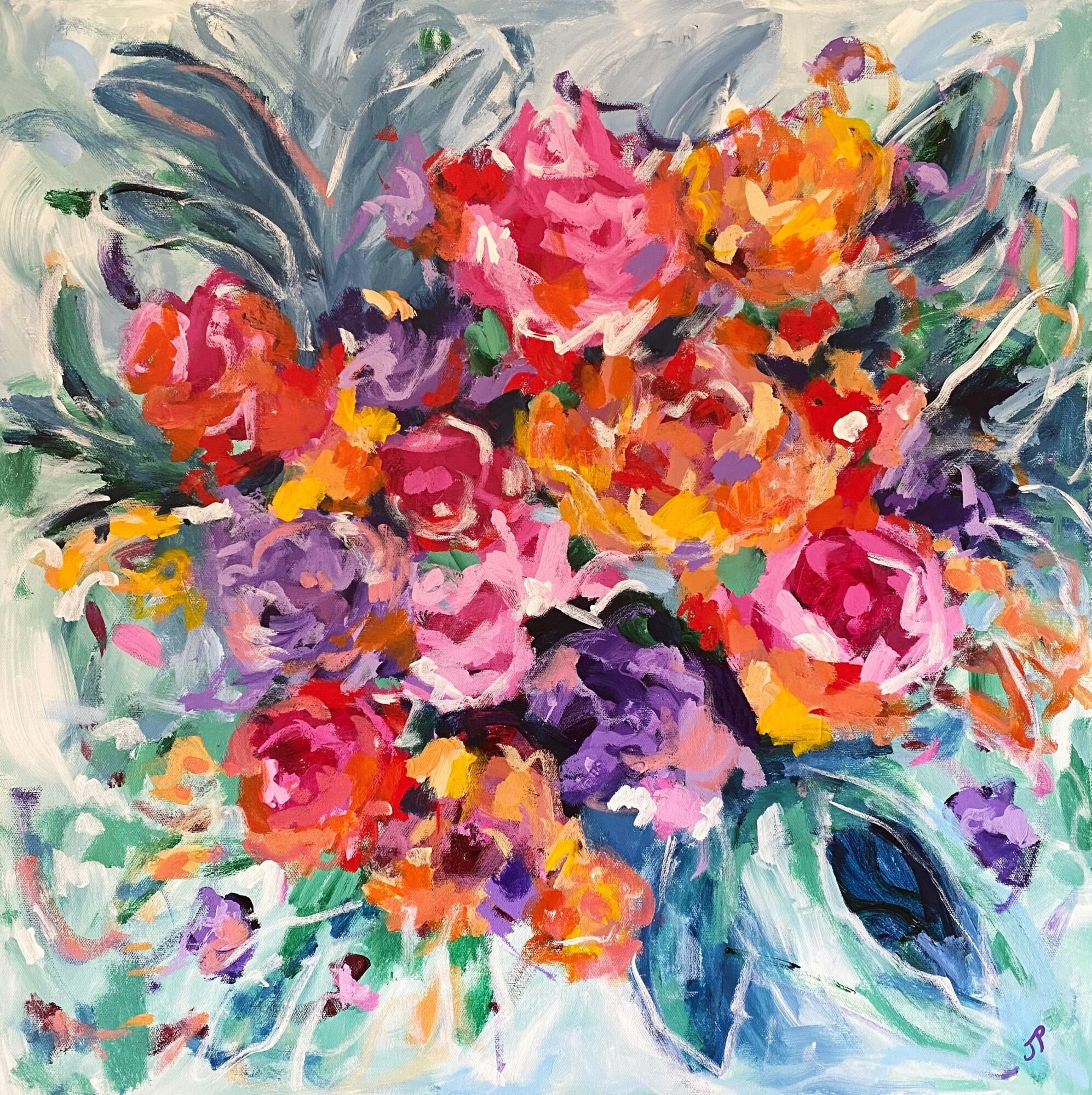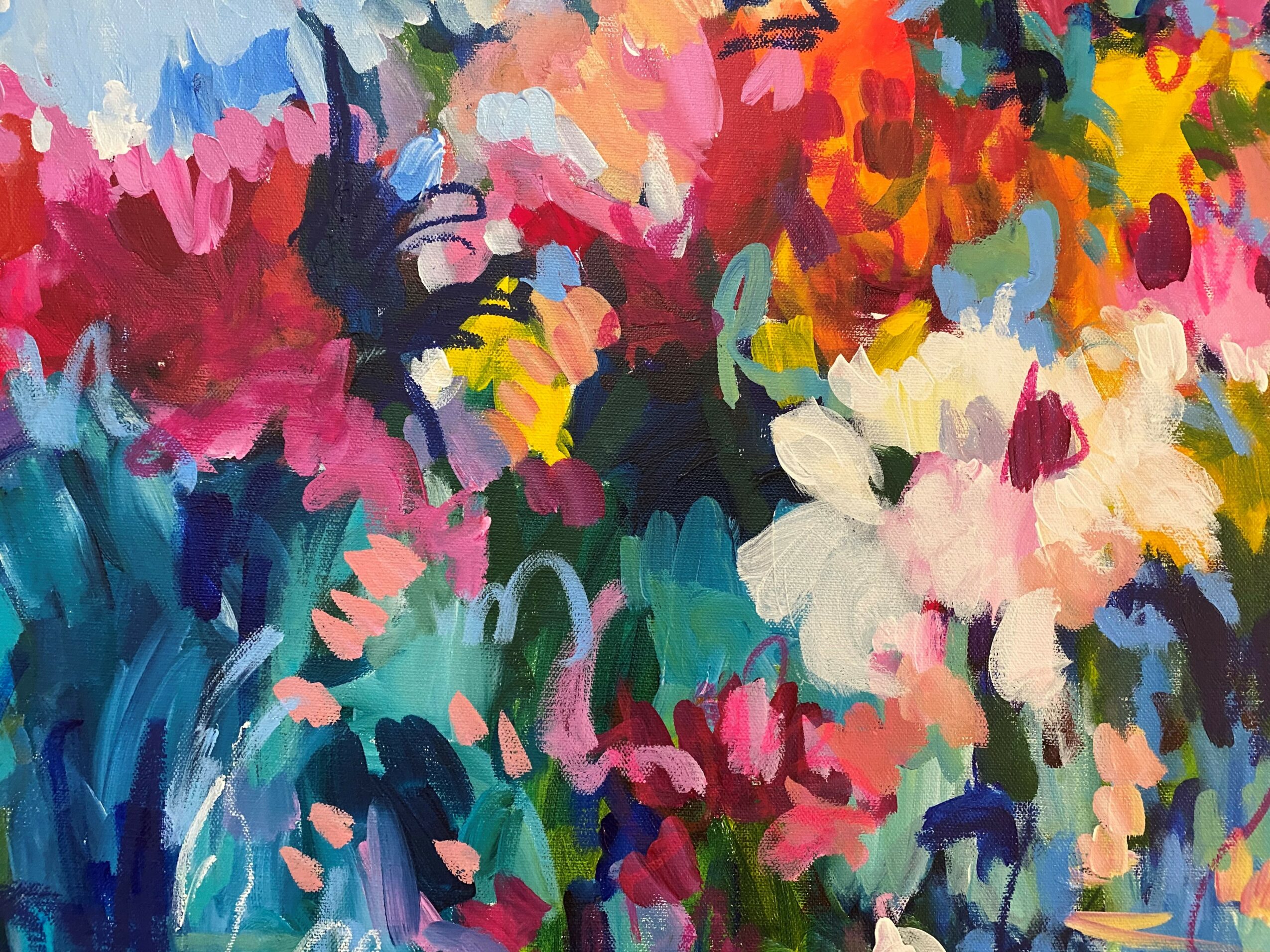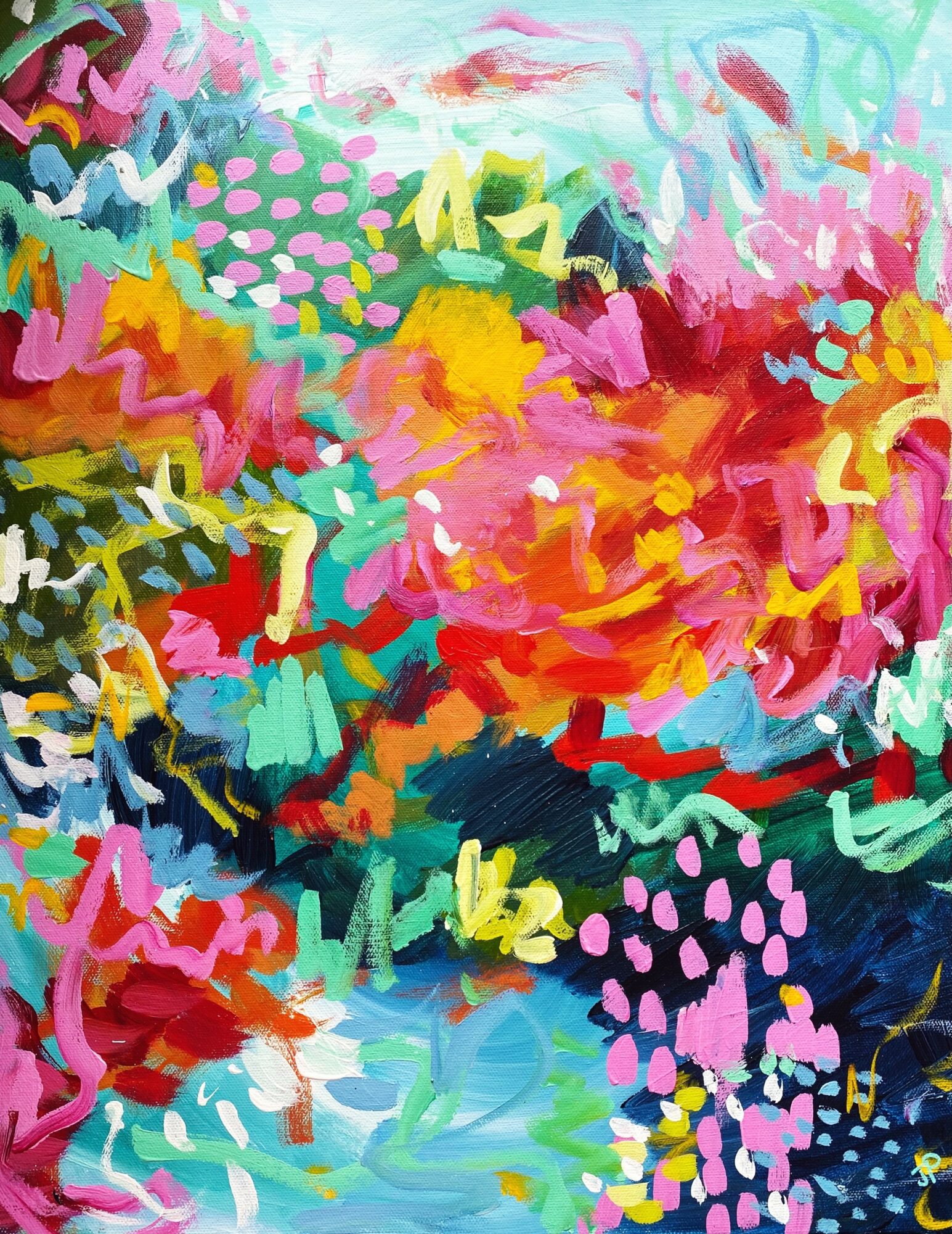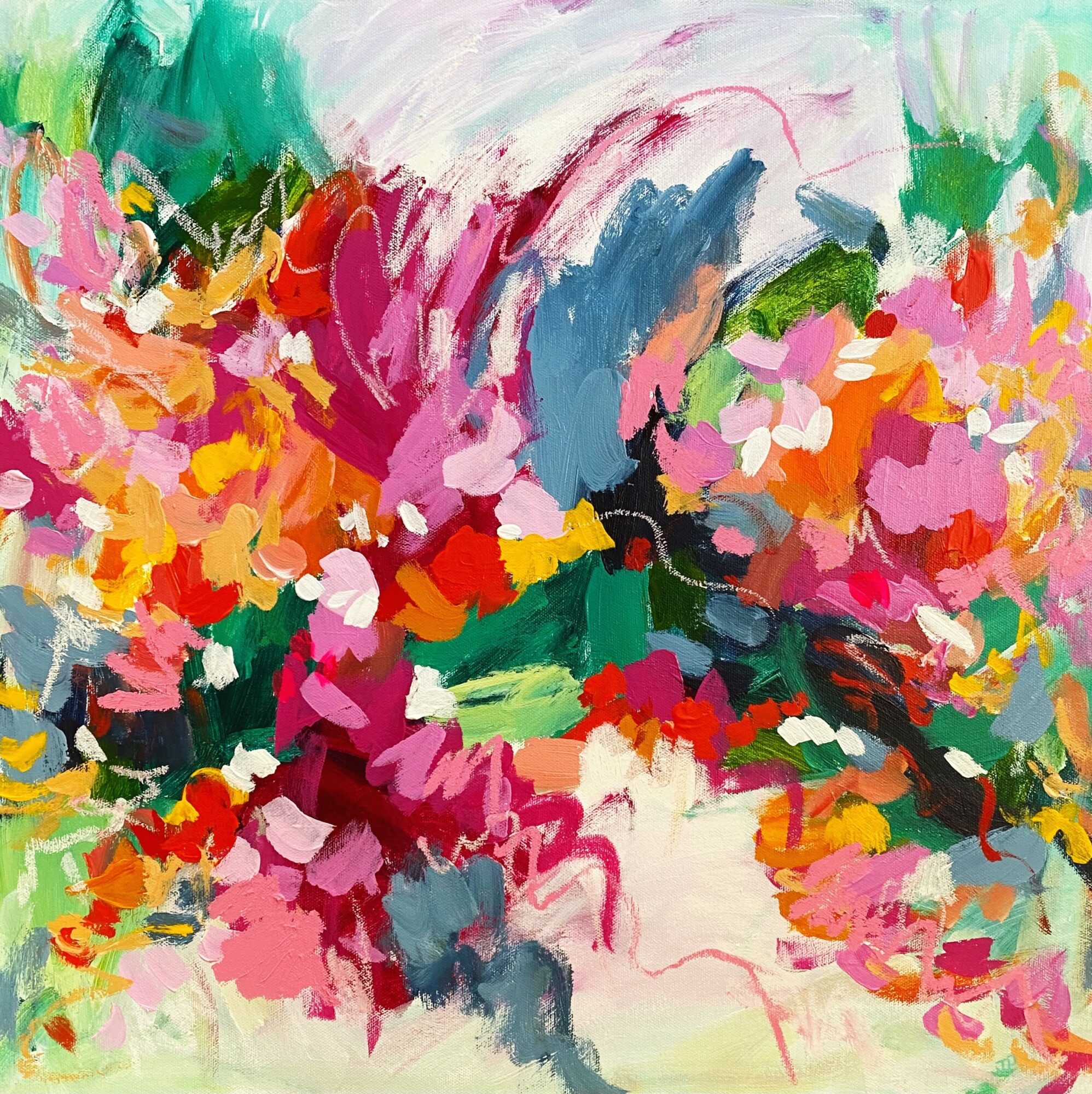 I am an acrylic painter. I enjoy painting wild abstracts and florals with lots of bold colors, texture, and messy movements. I tend to stick to an unapologetically colorful palette. I see inspiration everywhere, especially in nature. I am constantly seeing painting compositions in leaves and branches of trees or rows of flowers. I am most known for my bright, colorful paintings. When it comes to art, more is absolutely more! One thing that sets me apart from other artists is that I am more approachable. I want art to be accessible to all because I truly believe in the magic of it. So many artists and galleries are so stuffy and make you think you need a fine arts degree just to walk in the door. Yes, art is a way of expressing deep emotions but sometimes it’s just something pretty to look at. It’s ok if it doesn’t have some deep meaning. I think people can relate to me because I am a real, flawed human just trying to do my best. And I am pretty good about making fun of myself!