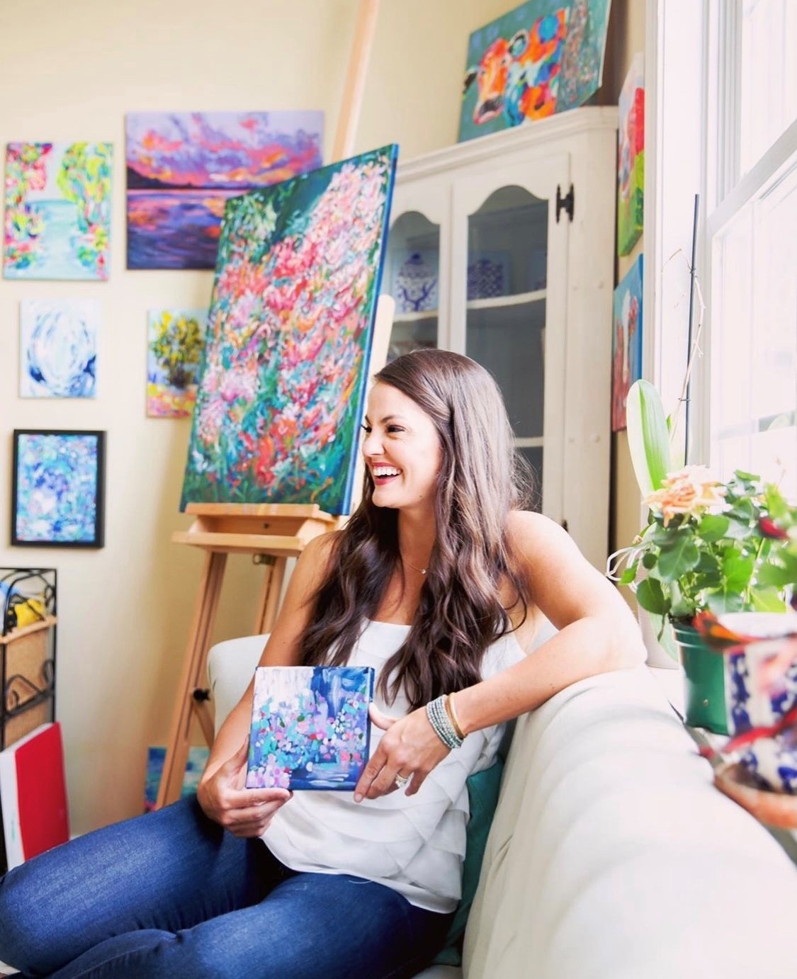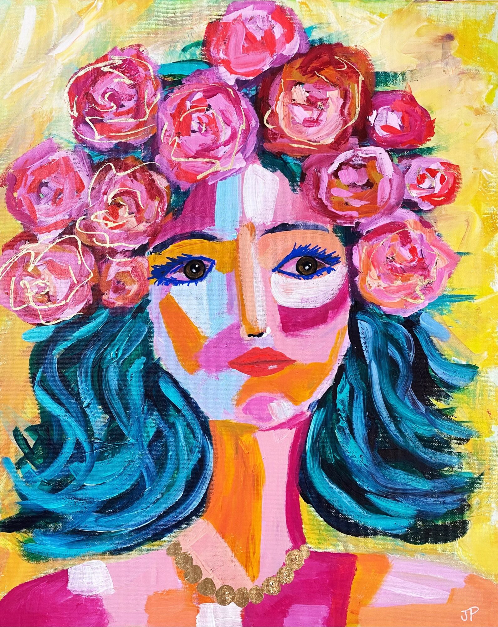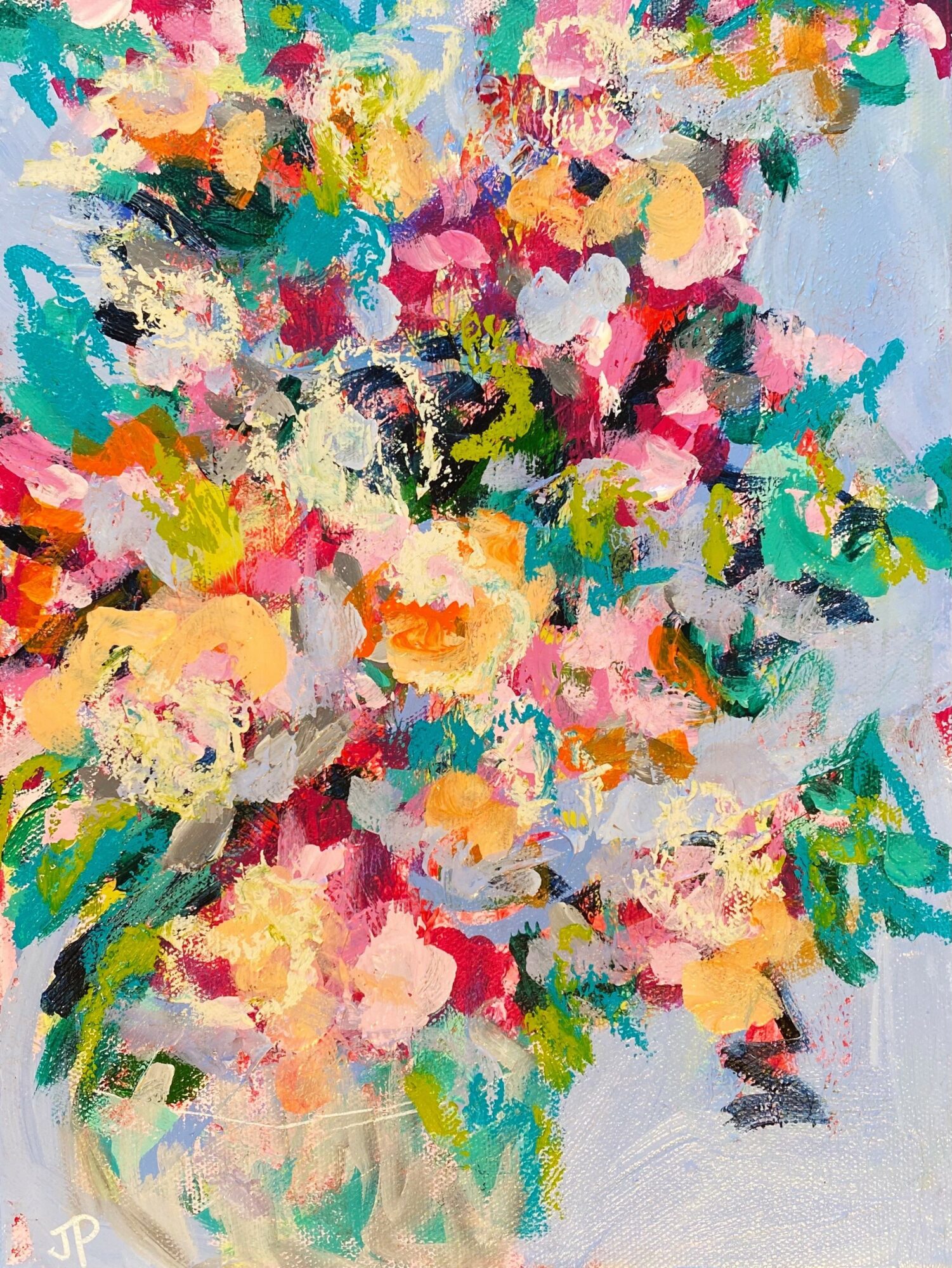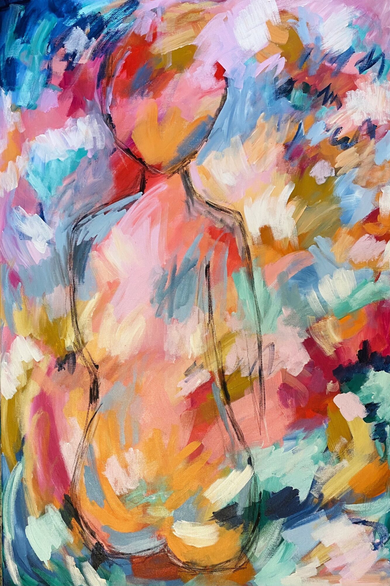 I am an acrylic painter. I enjoy painting wild abstracts and florals with lots of bold colors, texture, and messy movements. I tend to stick to an unapologetically colorful palette. I see inspiration everywhere, especially in nature. I am constantly seeing painting compositions in leaves and branches of trees or rows of flowers. I am most known for my bright, colorful paintings. When it comes to art, more is absolutely more! One thing that sets me apart from other artists is that I am more approachable. I want art to be accessible to all because I truly believe in the magic of it. So many artists and galleries are so stuffy and make you think you need a fine arts degree just to walk in the door. Yes, art is a way of expressing deep emotions but sometimes it’s just something pretty to look at. It’s ok if it doesn’t have some deep meaning. I think people can relate to me because I am a real, flawed human just trying to do my best. And I am pretty good about making fun of myself!