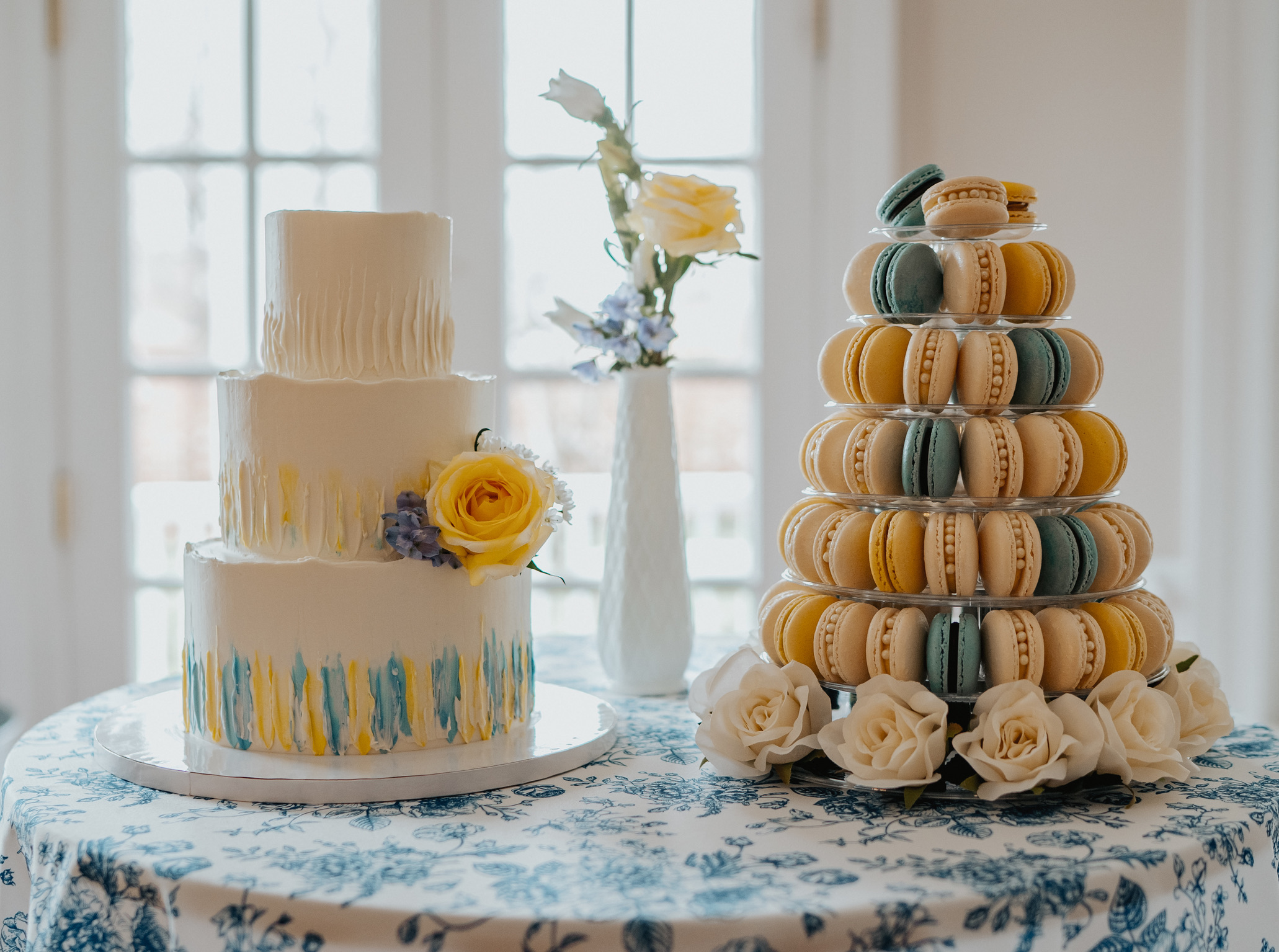 Luisa NC Photography (yellow, blue, and white cake/macarons)