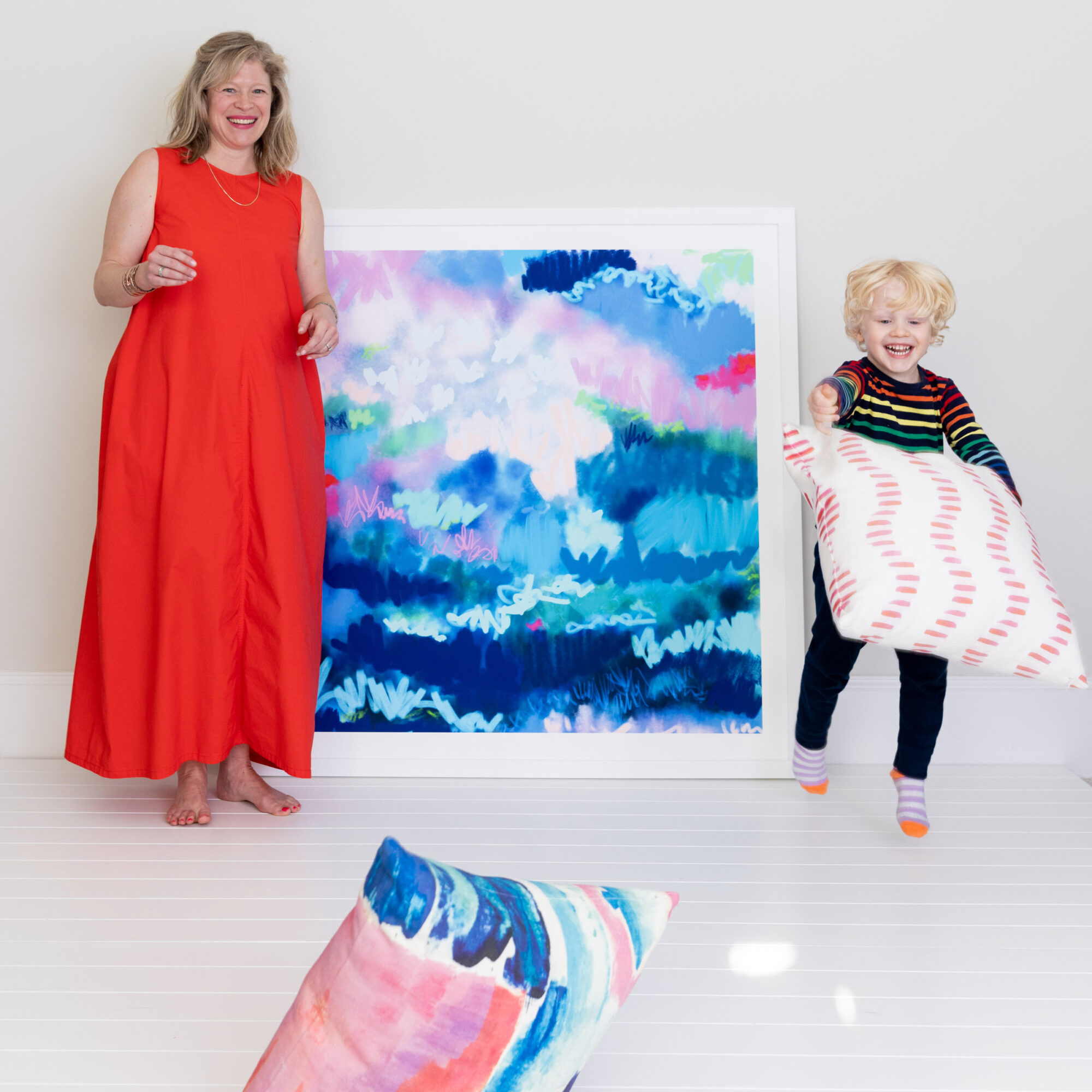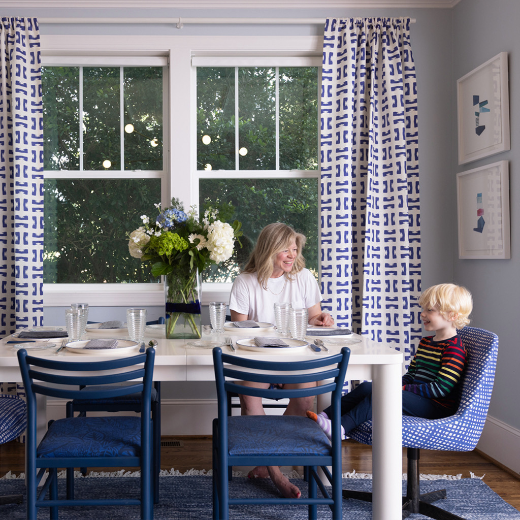 My path to embrace my calling as an artist has been a meandering one. However, for as long as I can remember I have wanted to create. I was the kid that had art themed birthday parties and liked listening to the audioguides my dad insisted on at museum exhibitions, the earliest one I remember was a Gauguin exhibit in DC, the colors so beautiful and vibrant. I majored in visual art at Duke and studied abroad at SACI, an art school in Florence. After graduation, I moved to Manhattan and got a job as an intern at a contemporary art gallery in Chelsea. At the time, the next step to “becoming” an artist was to get a masters, but I was not ready to jump back into grad school and after a chance encounter with a high-end interior designer, I took a job as her assistant and fell into a design career. I wouldn’t return to making art until I went back to school in 2010, attending Parsons for interior design, but it was just for fun as I was focused on starting my own residential design firm. Fast forward to the spring of 2021, I had my second child and was feeling burnt out from a lack of real creativity. I had dabbled here and there exploring my love of painting and collage, even turning many of those works into textile patterns, but that fall I felt a real pull, a calling you might say, back to my true love of making art. Now I share my time between my two passions, art and design. I still work as a designer and love creating beautiful spaces for my clients and am thrilled to have found a way to link my art with my design practice through a collection of textiles and wallcoverings using imagery taken directly from my artwork.
