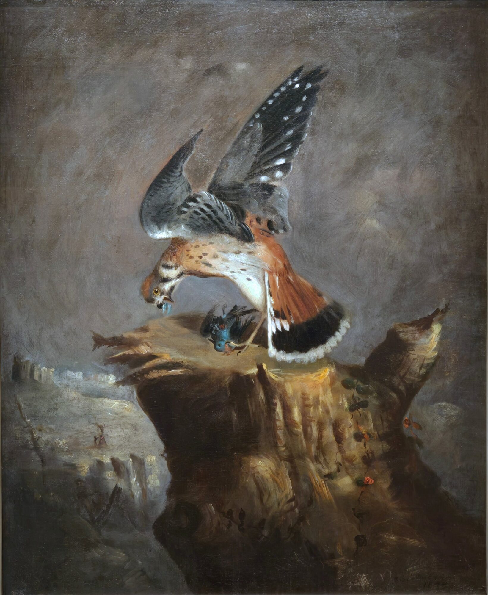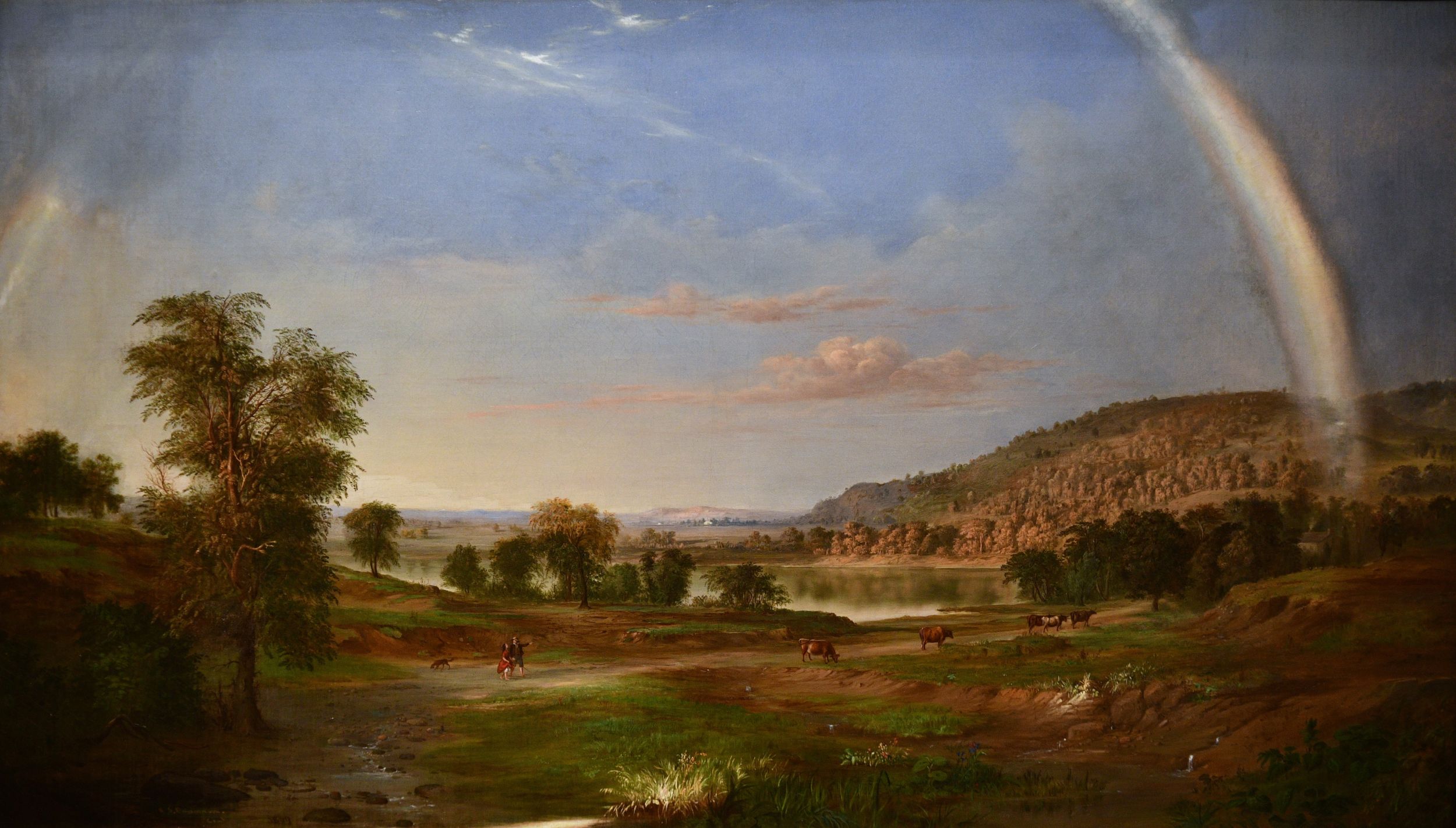 Duncanson often used cryptic allusions in his works, almost always facing north, birds flying north, birds next to a maple leaf (symbol of Canada), faces in clouds as if God was pointing the right direction, windmills to imply air and the freedom of movement, and in his most famous work from 1859, after the failure of John Browns raid, cattle headed to a rainbow. Abolitionist letters never referred to runaway slaves, period literature cited that as admitting to a federal crime, so they skirted around the forbidden topic when they asked about the safety of stray cattle hoping they arrived safely. A dangerous journey indeed.