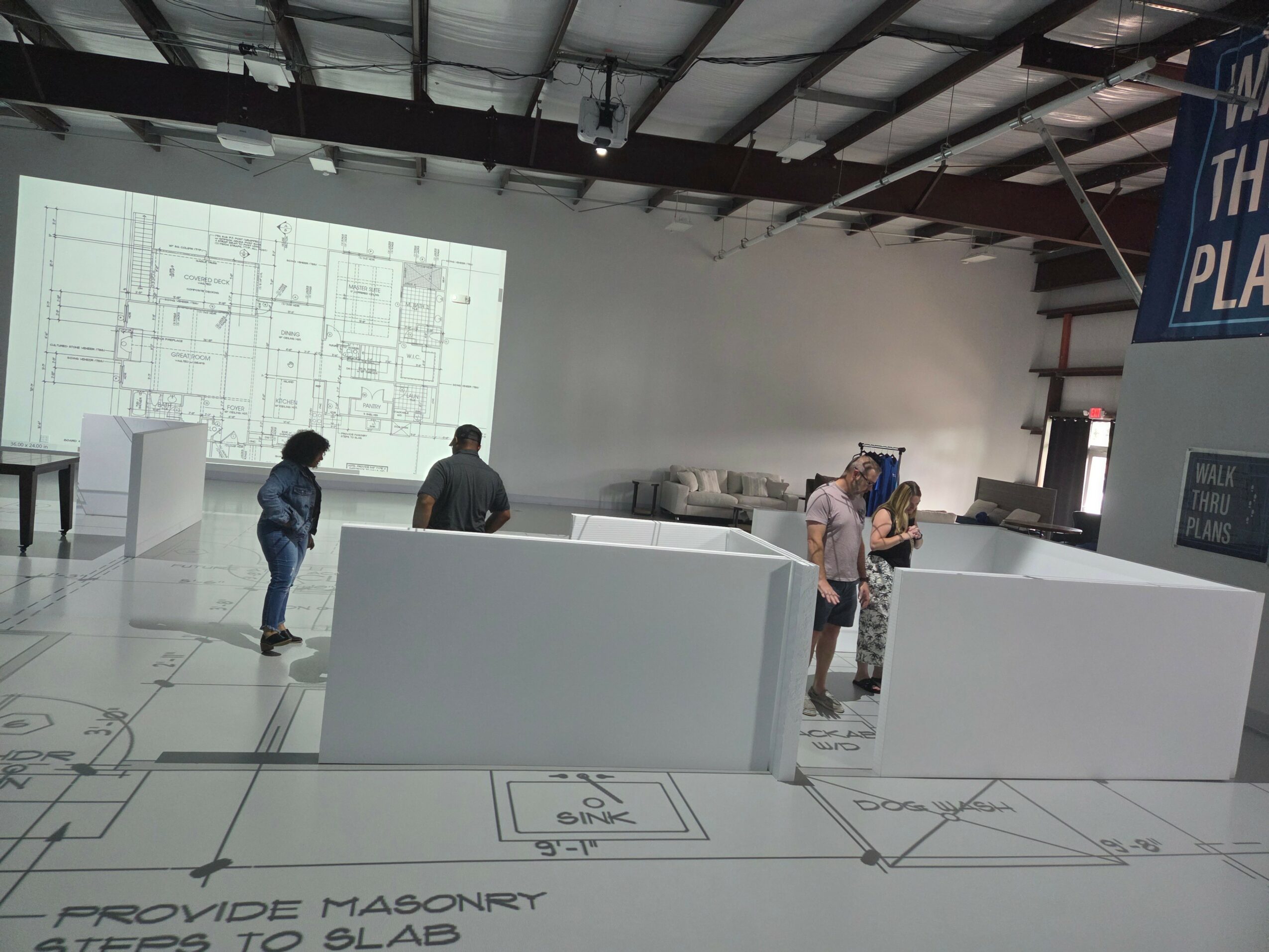 Walk Thru Plans – Charlotte is an architectural design studio, where we bring your plans to life. We take your blueprints and make them real-life scale, so that our clients are able to experience their plans before a single brick is laid. We have real furniture on wheels and movable walls so that you can really feel your new space.