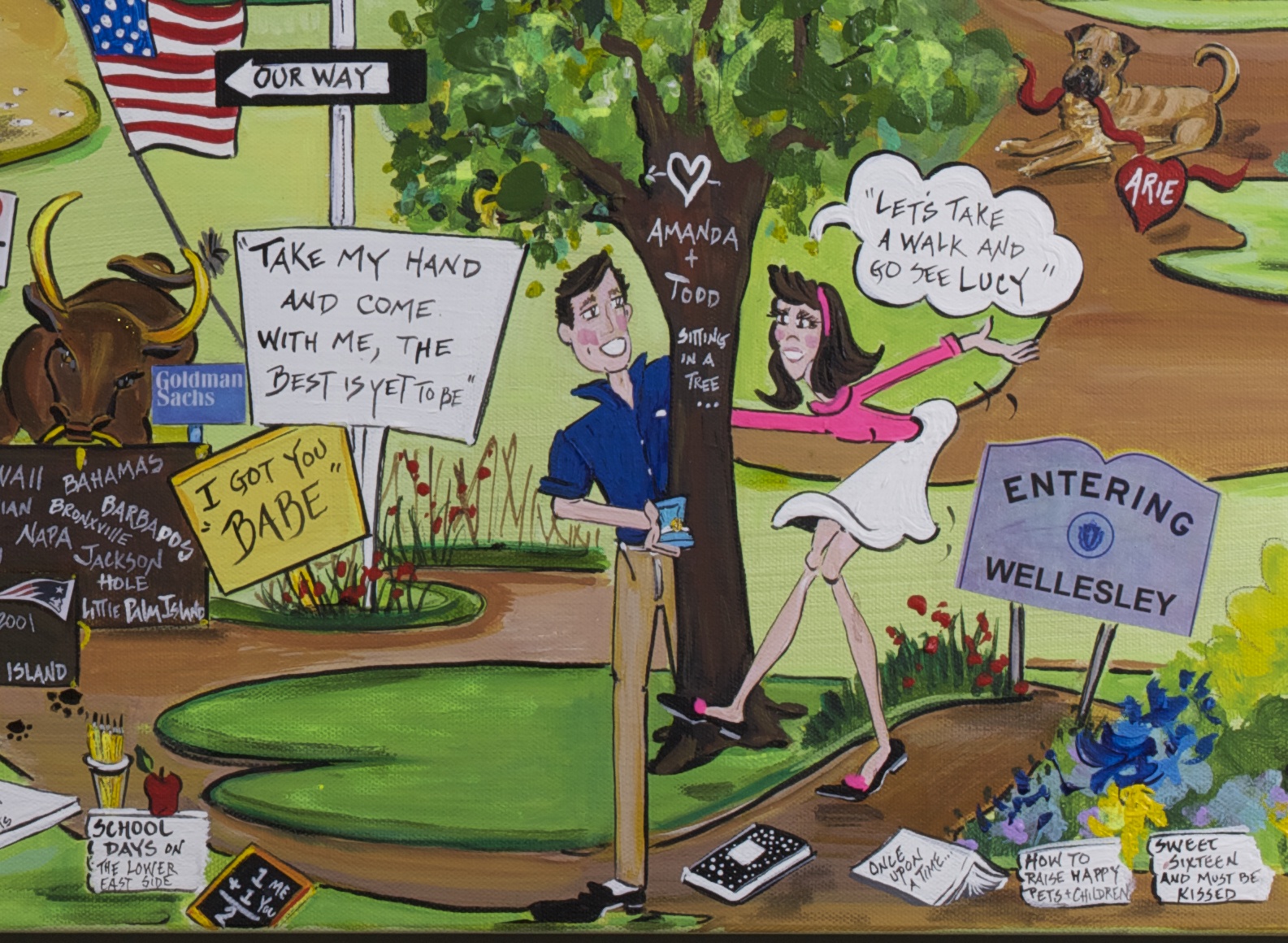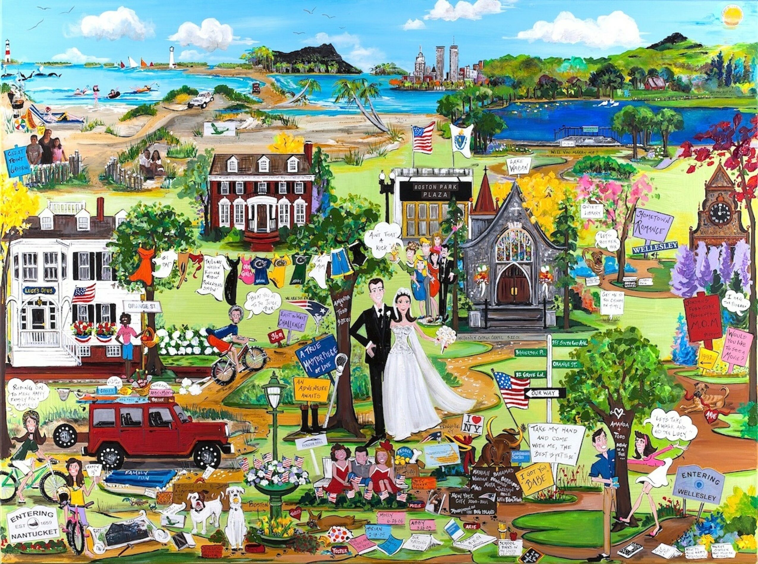 My artwork can feature a hand painted ornament of a simple home image or a lifetime of memories, memories are what my signature artwork is all about. Refreshingly different in the art world, I hand paint the story of your life, with a bit of paint and my brush. My artistic style is light-hearted and not stuffy, as I feature the dynamic lives people have led and celebrate them. One client called her canvas “a hidden painting of their life” as the moments were tucked within the illustrations; Homes, weddings, travel, pets, as soon as I hear a client’s story and see their personality, I begin to design how the art will translate their special moments, and their story springs to life once again. Every commission brings immense joy and purpose to my life as an artist, and leaves the studio with a little piece of my creative self. The enthusiasm that goes into each piece of art can be felt, as I find myself visualizing where all the pieces are hung across the country. In homes, corporate headquarters, hospitals, schools, and that people are enjoying them makes me especially proud that I have assisted families see the power and beauty of their own life stories.